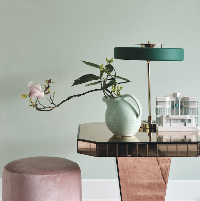 Ce vert frais presque mentholé a une qualité désaturée comme si elle était toujours visible dans la lumière claire et brillante.