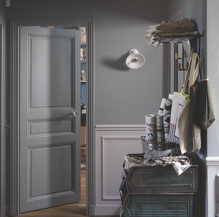 Plummett est un gris architectural intense évoquant le plomb de pêche. Cette couleur apporte une modernité minimaliste et industrielle, particulièrement prononcée dans les petits espaces et idéal pour structurer les boiseries et murs.